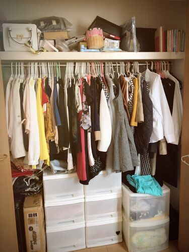 袋でその1、その2カウントしていきますლ(・ิω・ิლ) 始まる前のクローゼット ここと、もう一つの部屋の収納の方にコート類がありました。 オフシーズンのトップスから。 ときめくものはクローゼットになおして、迷うもの捨てるものはとりあえず床に落としていき…